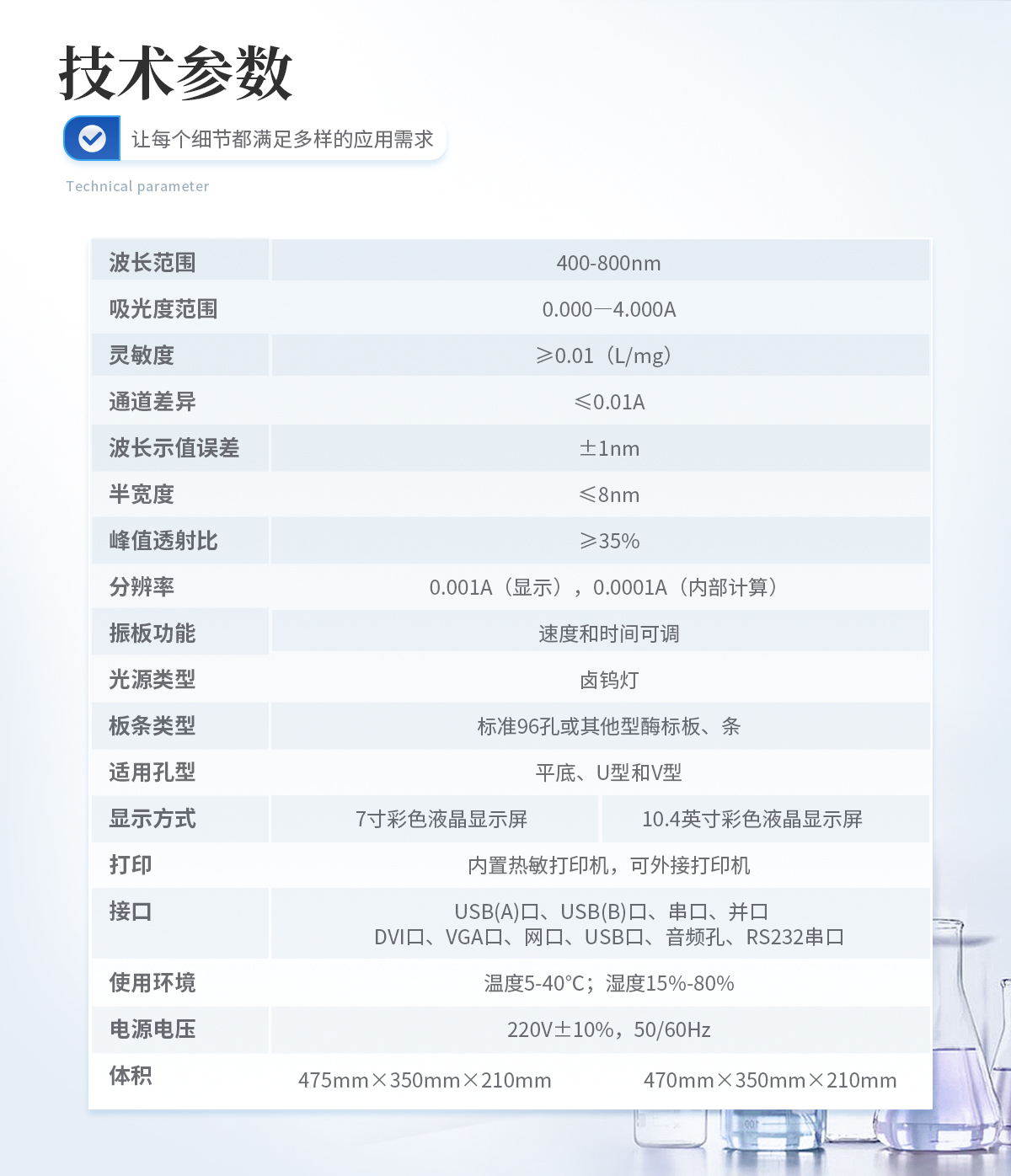 | *波長(zhǎng)范圍: 400-800nm | *濾光片配置:10個(gè)濾光片位置,標(biāo)配405nm、450nm、492nm、630nm,選配6定制波長(zhǎng) | 吸光度范圍:0.000―4.000A | *光通道數(shù):8通道光路檢測(cè),另設(shè)一個(gè)獨(dú)立參比通道(選配) | *示值穩(wěn)定性:≤±0.002A或≤0.5%T/10min。 | *示值誤差(準(zhǔn)確性):≤±0.005A或±0.2%T。 | *重復(fù)性:≤0.2%或≤0.2%T。 | 靈敏度:≥0.01(L/mg)。 | 通道差異:≤0.01A。 | 波長(zhǎng)示值誤差:±1nm | 半寬度:≤8nm | 峰值透射比:≥35% | 分辨率:0.001A(顯示),0.0001A(內(nèi)部計(jì)算) | *讀板速度:?jiǎn)尾ㄩL(zhǎng)≤3秒/96孔,雙波長(zhǎng)≤6秒/96孔 | 振板功能:速度和時(shí)間可調(diào) | 光源類型:鹵鎢燈 | 板條類型:標(biāo)準(zhǔn)96孔或其他型酶標(biāo)板、條 | 適用孔型:平底、U型和V型 | 顯示方式:7寸彩色液晶顯示屏顯示 | 輸入方式:觸摸屏輸入,可選配鼠標(biāo)和鍵盤 | 打印:內(nèi)置熱敏打印機(jī),可外接打印機(jī) | 接 口: USB(A)口、USB(B)口、串口、并口 | *數(shù)據(jù)儲(chǔ)存:200,000個(gè)測(cè)試數(shù)據(jù),500個(gè)以上測(cè)試項(xiàng)目(可擴(kuò)展) | 使用環(huán)境:溫度5-40℃;濕度15%-80% | 電源電壓:220V±10%,50/60Hz | 體積:475mm×350mm×210mm(長(zhǎng)×寬×高) | 重量:11.5Kg |