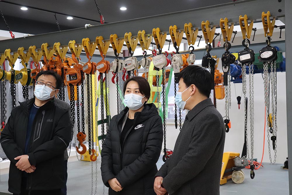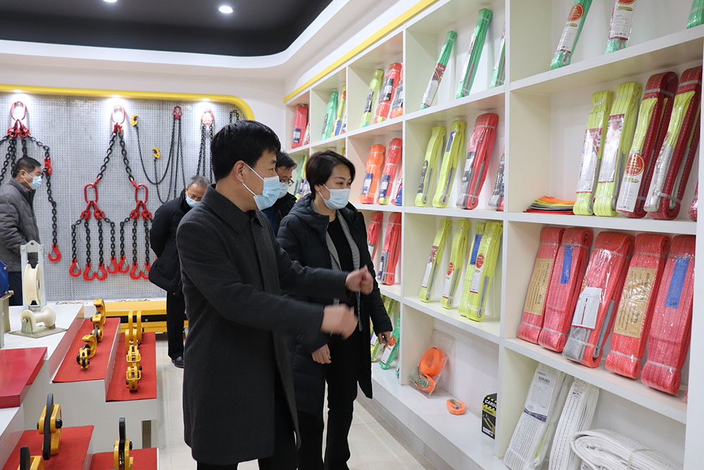 在產(chǎn)品展示廳里,劉丹區(qū)長聽取了蘇總經(jīng)理對吊裝帶、起重鏈條、手拉葫蘆等產(chǎn)品的介紹后,對我公司實力、產(chǎn)品質(zhì)量表示進(jìn)一步肯定。同時詢問了公司在