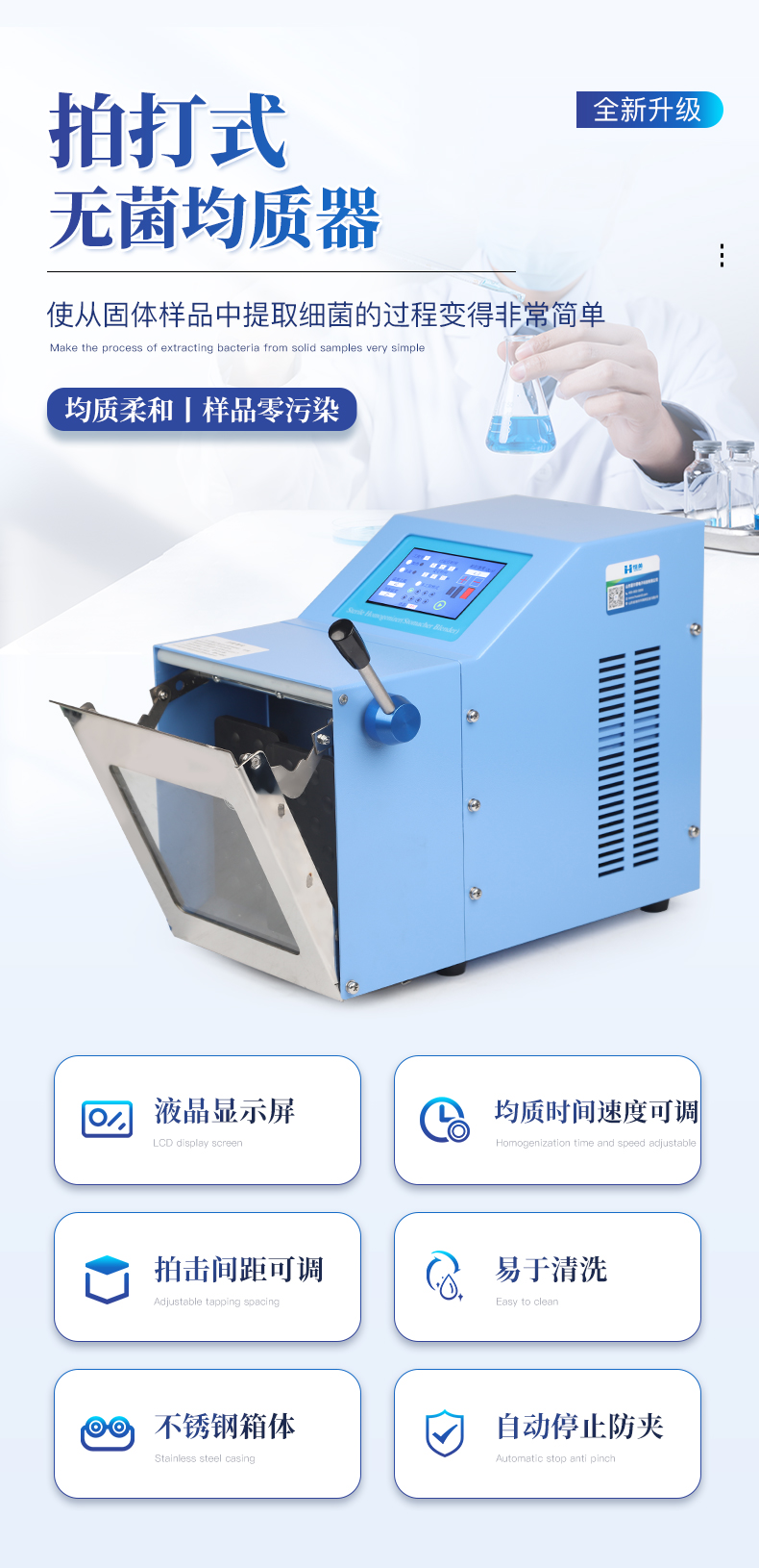 產(chǎn)品簡介:無菌均質(zhì)器使從固體樣品中提取細(xì)菌的過程變得非常簡單,只需將樣品和稀釋液加入到無菌的樣品袋中,然后將樣品袋放入拍擊式均質(zhì)器中即可完成樣品的處理。有效地分離被包含在固體樣品內(nèi)部和表面的微生物均一樣品,確保無菌袋中混合全部的樣品。處理后的樣品溶液可以直接進(jìn)行取樣和分析,沒有樣品的變化和交叉污染的危險。