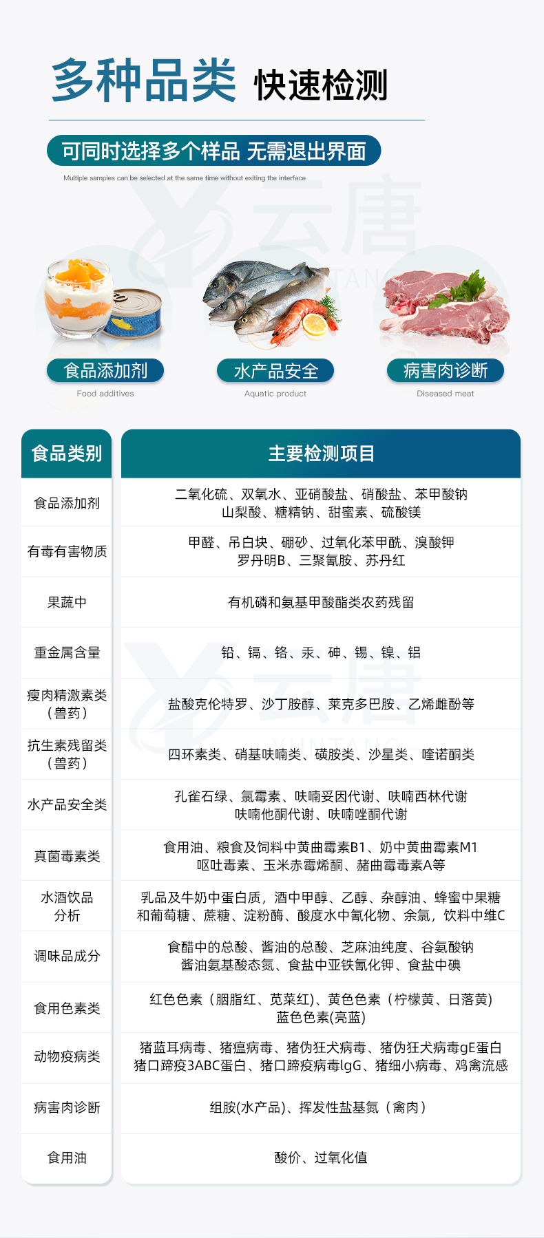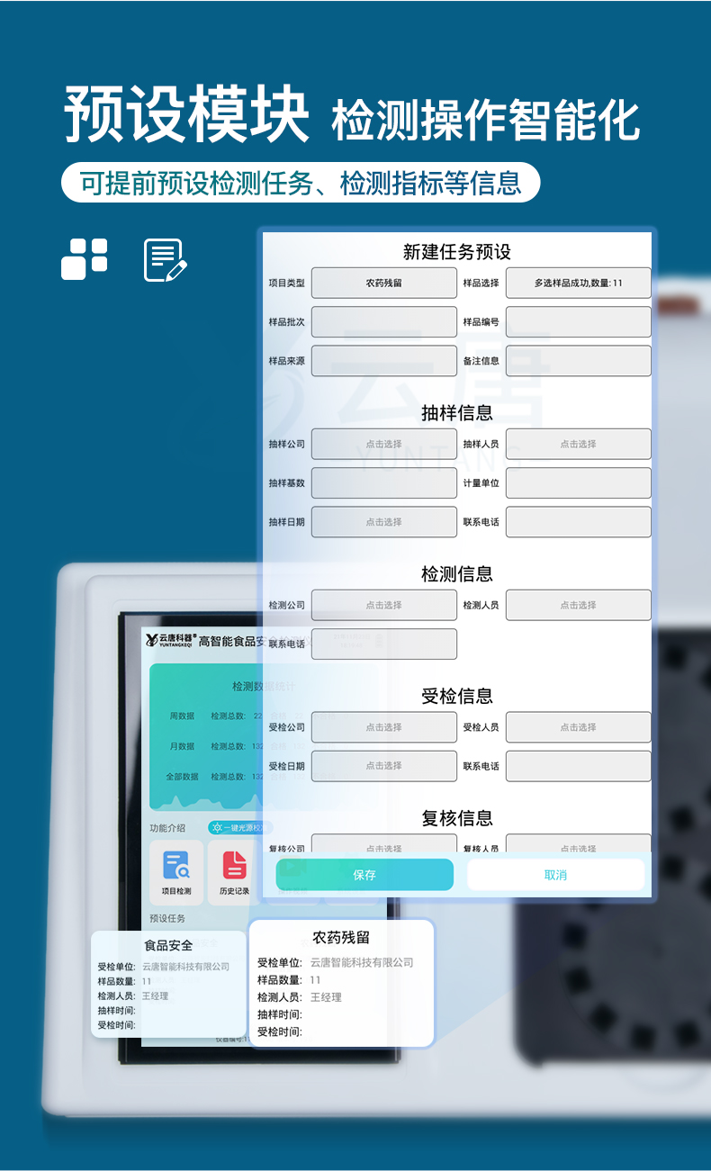 山東云唐智能科技有限公司生產的高智能食品安全檢測儀為集成化食品安全快速檢測分析設備,采用臺式一體化設計,可快速檢測200多種食品安全項目,包含非食用化學物質、濫用食品添加劑、農藥殘留、重金屬、病害肉、營養強化劑等項目的定量檢測。