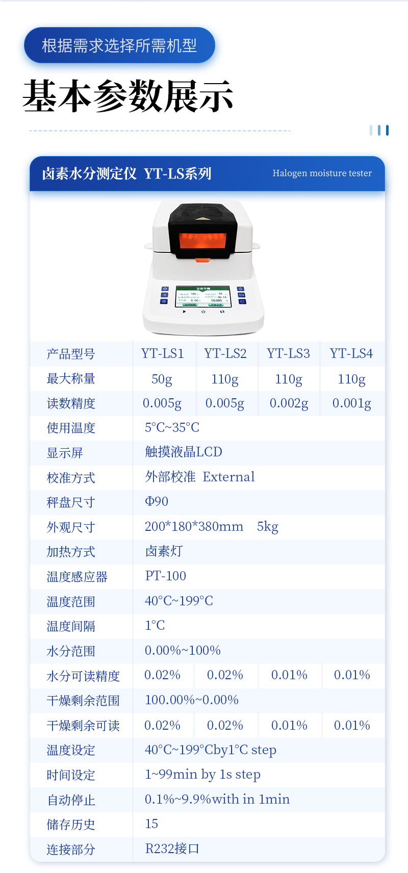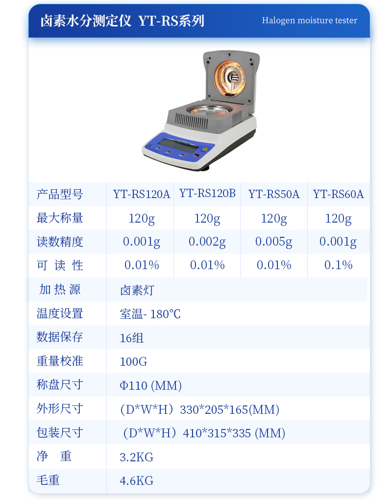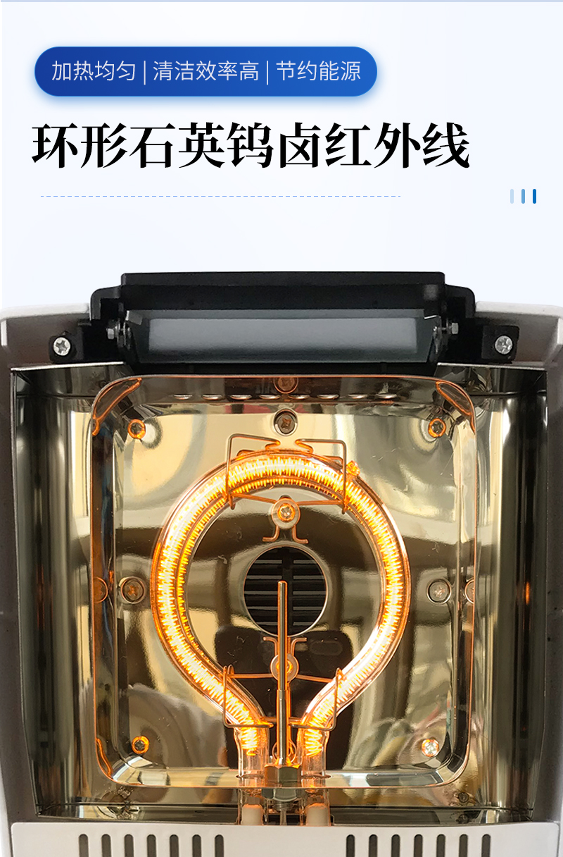 環(huán)狀的鹵素?zé)舸_保樣品得到均勻加熱,操作簡便、測(cè)量準(zhǔn)確。鹵素水分測(cè)定儀在測(cè)量樣品重量的同時(shí),儀器采用環(huán)形管鹵素加熱方式,快速干燥樣品,在干燥過程中,水分儀持續(xù)測(cè)量并即時(shí)顯示樣品丟失的水分含量%,干燥程序完成后,*終測(cè)定的水分含量值被鎖定顯示。與國際烘箱加熱法相比,鹵素加熱可以在高溫下將樣品均勻地快速干燥,樣品表面不易受損,其檢測(cè)結(jié)果與國標(biāo)烘箱法具有良好的一致性,具有可替代性,且檢測(cè)效率遠(yuǎn)遠(yuǎn)高于烘箱法。智能化操作,一般樣品只需幾分鐘即可完成測(cè)定。該儀器操作簡單,測(cè)試準(zhǔn)確,顯示部分采用液晶顯示屏-使屏幕更加清晰明亮,示值清晰可見,分別可顯示水分值,樣品初值,終值,測(cè)定時(shí)間,溫度初值,*終值等數(shù)據(jù),并具有與計(jì)算機(jī),打印機(jī)連接功能、符合GLP規(guī)范的打印數(shù)據(jù)輸出。