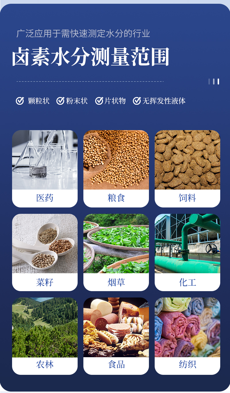 可廣泛應(yīng)用于一切需要快速測(cè)定水分的行業(yè),如醫(yī)藥,糧食、飼料、種子,菜籽,脫水蔬菜、煙草,化工,茶葉,食品、肉類以及紡織,農(nóng)林、造紙、橡膠、塑膠、紡織等行業(yè)中的實(shí)驗(yàn)室與生產(chǎn)過程中。同時(shí)滿足固體、顆粒、粉末、膠狀體及液體含水率的測(cè)定要求